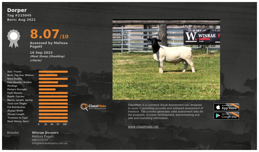 While the ClassiMate assessment system uses a unique algorithm to calculate structural scores, both systems adhere to the same Breed Standard and therefore ClassiMate scores generally correlate to the Dorper Typing System.